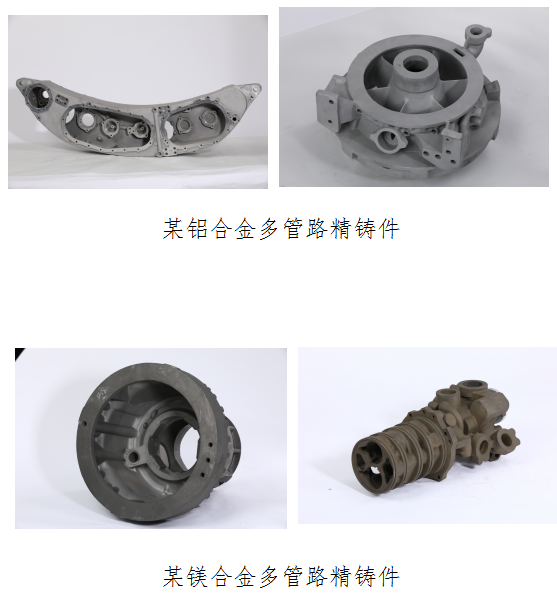 針對先進航空發動機進氣組件、附件傳動組件及燃油附件系統,集成化程度高,內部管路復雜,質量要求苛刻等特點,公司突破了鎂合金阻燃技術,高強度易潰散型芯制備及其定位技術,輕質合金組織和性能控制技術,解決了輕質合金精鑄件的疏松、偏析、油管路偏芯斷芯等共性技術問題。制備的復雜多油管路精鑄件最大直徑達920mm,管路達48條,最長管路達1.8米,管路最細直徑6mm,表面及內部質量滿足HB7780-2005Ⅰ類鑄件要求。此類產品可滿足國內新型航空發動機的研制和生產需求,應用前景廣闊。