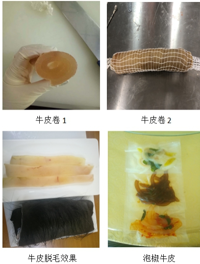 近年來,肉牛與牛肉價格持續上漲為牛皮食用提升牛皮價格及肉牛養殖、屠宰加工收益市場空間日益廣闊,解決傳統燙燎脫毛時間長、毛根殘留等效益低下技術問題呼聲日趨強烈。針對這一技術問題,本單位對生物酶制劑及其使用溫度、劑量等進行了篩選優化,進而形成牛皮食用酶法脫毛技術成果。該成果應用較之傳統脫毛具有更加安全、時間短、脫毛凈、效率高、成本低等優點,可實現牛皮食用脫毛工廠化、規?;a。