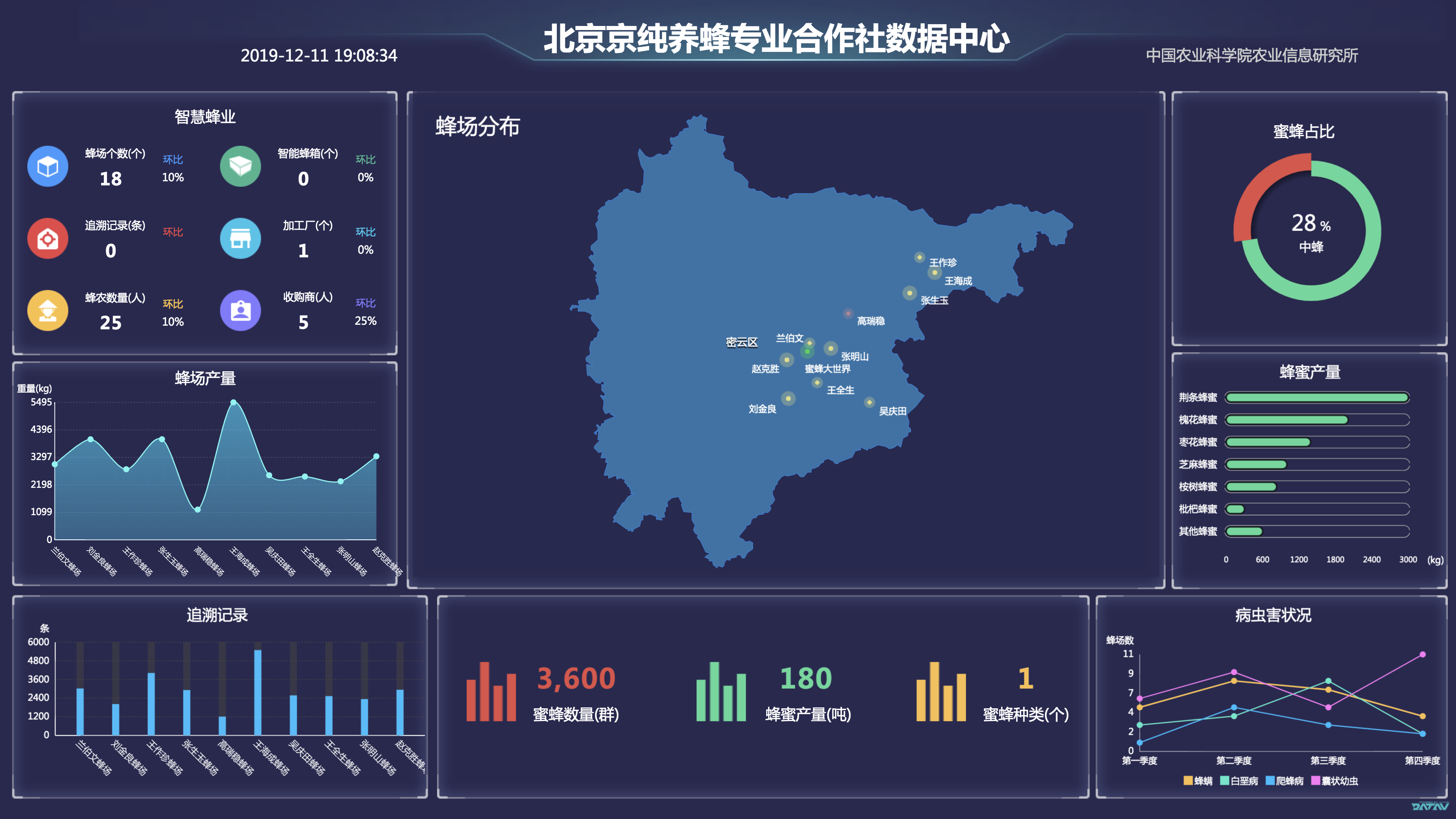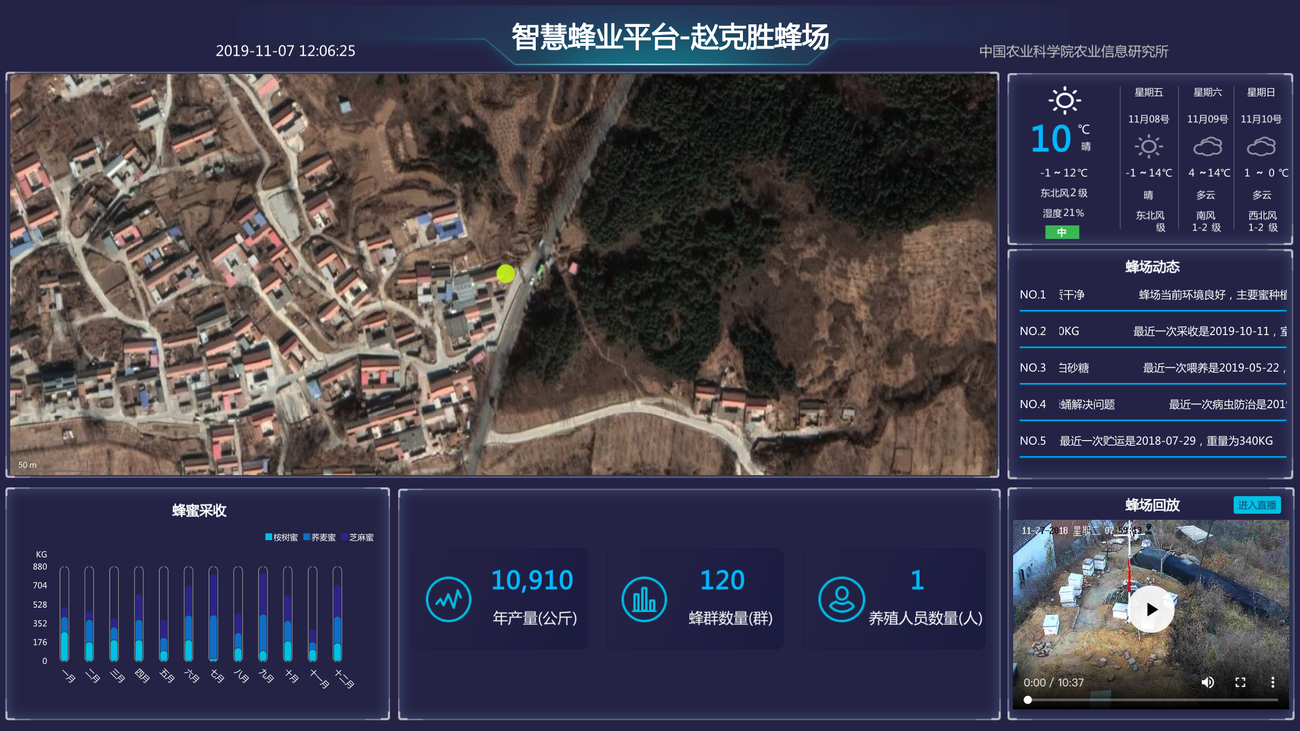 提供蜂場天氣實時監測、24小時視頻監控蜂場環境、智能蜂箱實時報告蜂群活動及產蜜情況、蜂產品質量安全追溯工具、大數據分析、管理和可視化平臺,構建集信息采集、智能管理和決策服務于一體的全套解決方案,提供標準化、信息化、智能化蜂業信息服務。
