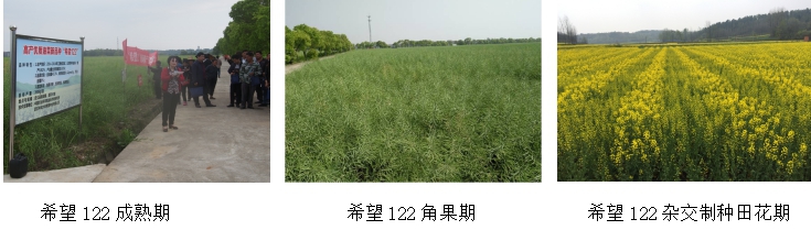 “希望122”屬甘藍型油菜雜交種。在長江上游、江西省和春油菜區的平均全生育期分別為206.4天、203.8天和132天。株高176.3厘米,分枝部位高度80.6厘米,有效分枝數6.2個,單株有效角果數240.1個,每角粒數20.9粒,千粒重4.0克;含油量42.22%。2014-2016年長江上游區兩年平均畝產182.43kg,比對照南油12增產11.4%;2014-2016年江西省兩年區試平均畝產159.19 kg,比對照中油雜12增產8.83%;2016年和2017年國家春油菜品種試驗,平均畝產237.99 kg,比對照青雜5號增產3.52%。適應性廣,低抗菌核病,抗病毒病,抗倒性強,適宜機收。與傳統品種相比,每畝新增經濟效益60元以上,已在長江上游、江西省和春油菜區推廣應用,應用前景廣闊。