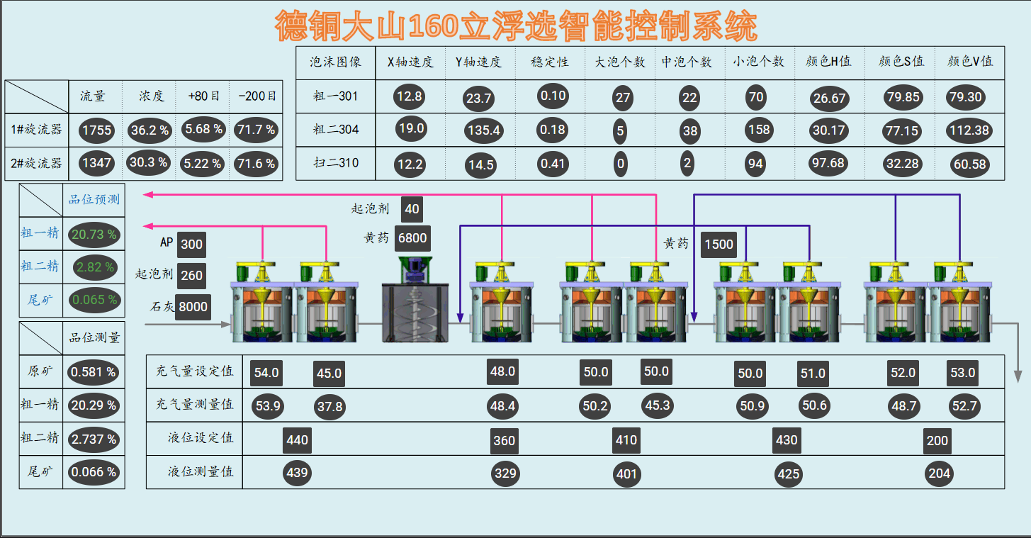根據“數字化礦山、智能工廠”的整體發展戰略以及企業自身高質量發展的需求,建設了礦山工業大數據集成展示平臺、基于5G技術的破碎機遠程遙控系統、電機車無人駕駛系統、智能礦山調度系統、浮選全流程優化控制系統、磨礦優化控制系統、濃密脫水過程智能優化控制系統、選礦搖床智能巡檢機器人、載流X熒光品位分析儀系統,基于5G技術、仿真建模技術和智能優化控制技術,實現了裝備的遠程遙控及無人化操作、礦車智能調度及生產數據精細化管理、實現了磨礦流程的穩定優化及浮選流程的智能控制、多種選礦參數的全自動監測分析等功能,提高了運輸效率、礦石處理量以及金屬回收率,在降低生產成本等方面效果顯著,取得了良好的控制效果及經濟效益。