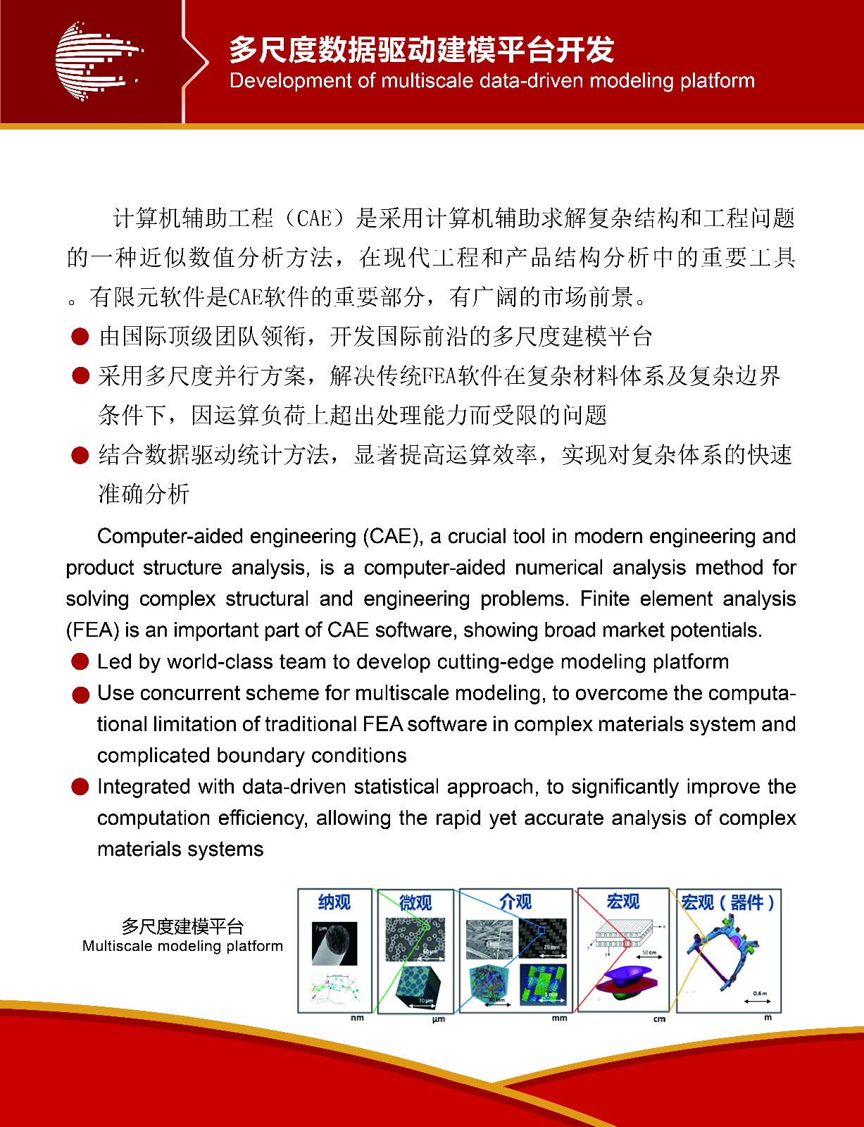 課題來源于美國西北大學。本課題利用結合材料納觀、微觀、介觀、宏觀的多尺度方法與統計方法的結合開發多尺度建模仿真軟件平臺,提高運算效率,有效突破了傳統有限元方法運算負荷及處理能力的限制,可進行復雜非均質材料及傳統材料在復雜邊界條件下的模擬。此平臺全面面向涉及材料、工程和制造業等各行業及相關的研究機構,可被各大企業的產品開發和制造部門應用于新產品的研發、測試和制造。目前已完成研發工作,擬計劃成立公司開展成果推廣。