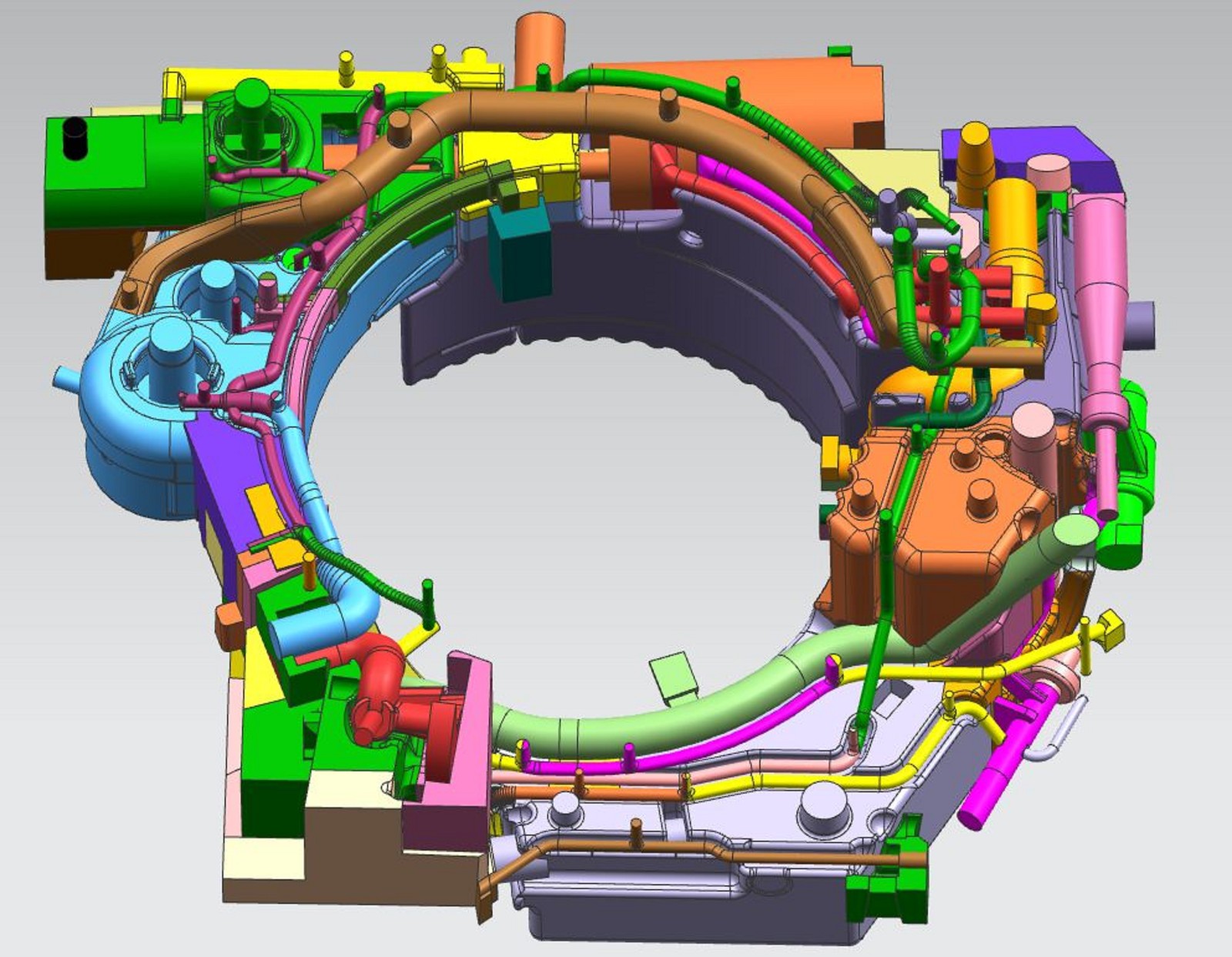 高端航空鋁、鎂合金機匣屬大型薄壁復雜鋁、鎂合金鑄件中制造難度較大的產品,內部存在多個封閉腔和多個復雜油管通路。目前世界上只有極少數發達國家擁有此類鑄件的生產技術。機匣內部質量、尺寸精度及機械性能要求均較高,鑄造難度較大,沈陽鑄造研究所有限公司針對薄壁復雜機匣鑄件產品,先后開發出精煉、變質、細化為一體的熔體處理技術、低溫加硅技術以及真空充型加壓凝固短流程鑄造成形、細長彎曲油管整體鑄造、數字化全流程高尺寸精度控制等國內領先的高端航空鋁、鎂合金機匣鑄造技術。利用上述技術,成形的鑄件產品本體力學性能:Rm≥335MPa,Rp0.2≥285MPa,A≥8%,HBS≥90,典型壁厚最薄2mm,油管最大總長4m,最小直徑4mm,鑄件尺寸精度CT6-CT7級,內部質量滿足航空標準 I類鑄件要求,目前,沈陽鑄造研究所有限公司已建成航空鋁、鎂合金鑄件多品種柔性生產線,保障多種型號薄壁復雜機匣鑄件產品的研制和生產。
