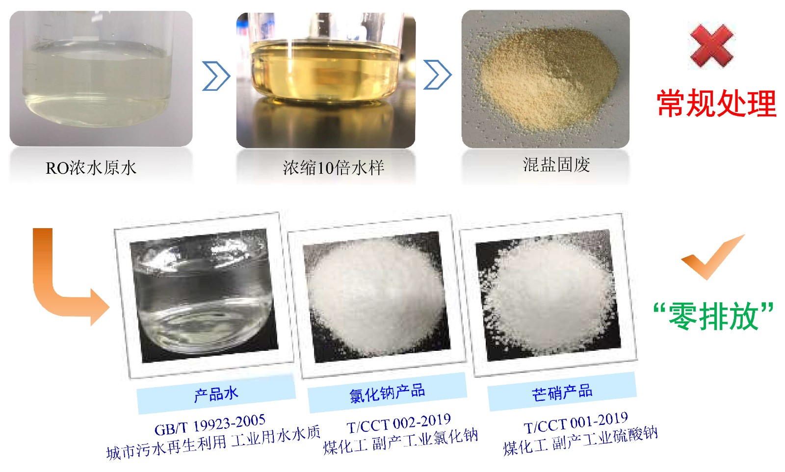 煉化污水深度處理回用是各煉化企業節水減排的主要措施之一,反滲透(簡稱RO)作為一種高效脫鹽技術被廣泛應用于煉化企業污水回用工程。反滲透(簡稱RO)污水脫鹽回用裝置在運行中暴露出末端高含鹽污水的處置難題,影響了污水回用的連續運行,成為制約該技術實現零排放的瓶頸。含有機物高鹽廢水近“零排放”技術解決了高濃鹽水回收過程中高能耗和可實現反滲透濃水中全部水分的梯級回收利用和鹽分的產品化,在低成本下完成廢水的減量化和資源化處理,穩定可靠,為解決反滲透廢水排放問題的提供了技術保障。